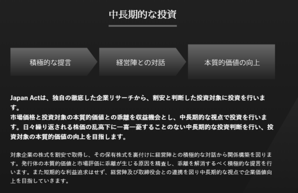 Japan Actã¯æ¥æ¬æ ªåŒã®æè³ãã¡ã€ã³ãšããæ ªäž»è°æ±ºæš©ãè¡äœ¿ããŠçµå¶é£ãžã®é¢äžãå³ãæ ªäŸ¡äžæãçãããšããã®ãæè³æ¹éã®äžã€ãšããŠããæè³äŒç€Ÿã§ãã
