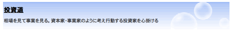 | 少額投資 | 1つの銘柄に投資する金額を資産全体の5%程度までに抑えることによって、多少リスクの高い銘柄でも資産全体に対する相対的なリスクを下げる方法。 |