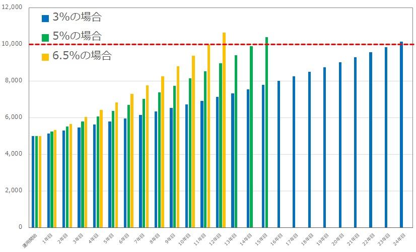 5,000万円を利回り3パーセント、5パーセント、6.5パーセントで運用した場合、次のグラフのように資産を増やすことができます。