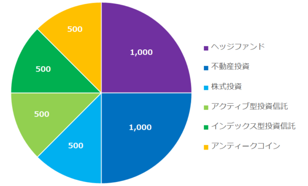 ヘッジファンドに1,000万円としましたが、2社のヘッジファンド会社に1,000万円ずつ預け、合計2,000万円を投資しても良いかもしれません。ヘッジファンドや不動産投資といった利回り高めの運用方法に多めに投資することで、大きな利益を狙うことができます。
