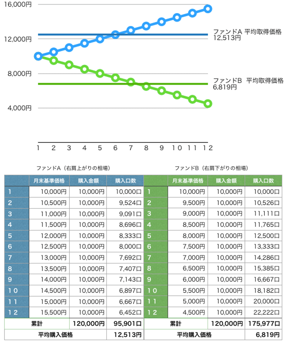 ドルコスト平均法は、毎回の購入額を一定にして、株価が高いときには購入する株数を少なく、株価が安いときには購入する株数が多くする仕組みです。