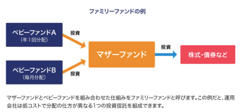 ファンド・オブ・ファンズに似た運用形式に「ファミリー・ファンド」があり、こちらは複数の投資信託の資金をまとめて、マザーファンドと呼ばれる投資信託に投資し、マザーファンドが株や債券などの資産に投資するものです。