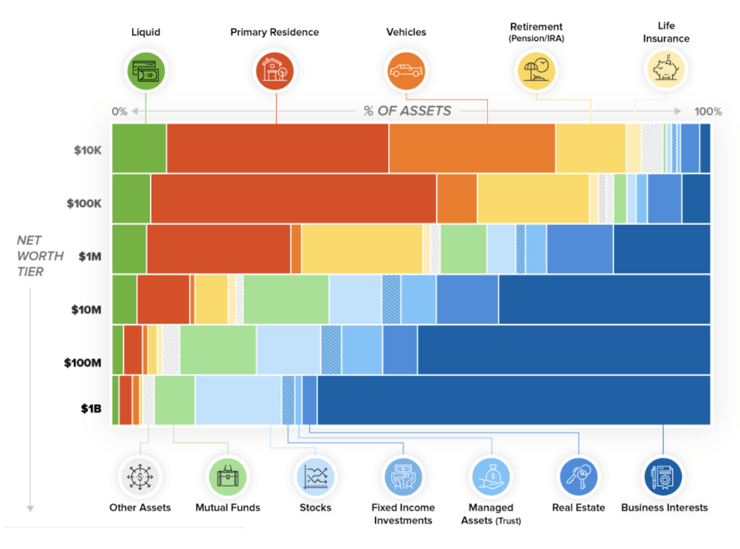 海外のメディアであるvisual capitalistの「What Assets Make Up Wealth?(どのような資産が富を作るか?)」という記事で保有資産額別にどんな資産を所持しているか、というデータが明らかにされています。