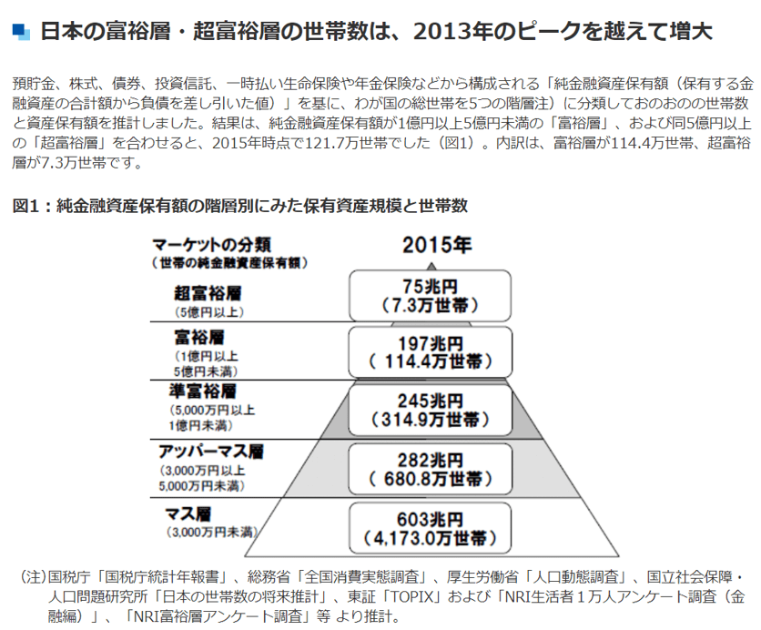 更に5億円以上の金融資産を持つ世帯は超富裕層と名付けられており、富裕層が114.4万世帯、その上の超富裕層は7.3万世帯というデータになっています。