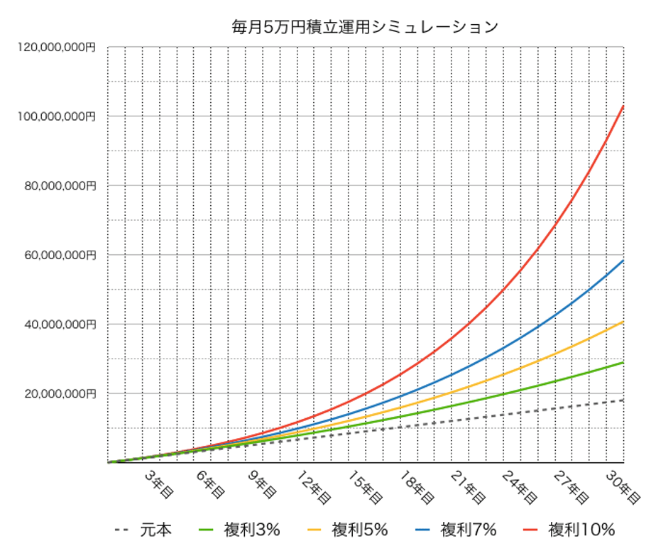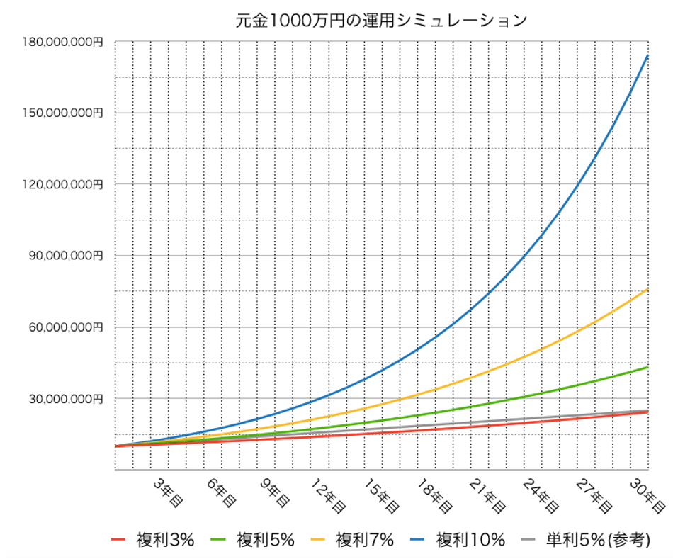 | 複利3% | 複利5% | 複利7% | 複利10% | 単利5%(参考) | |