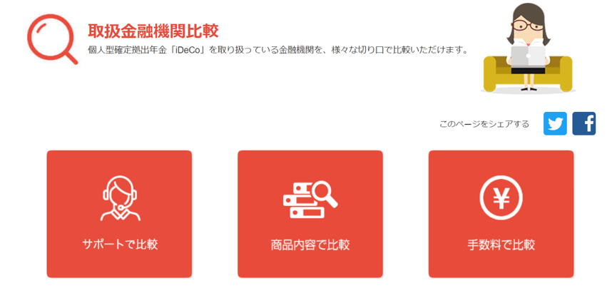 「サポート」「商品内容」「手数料」という三つの切り口から各金融機関を比較することができ、iDeCo利用にあたって非常に役に立つサービスを提供してくれます。