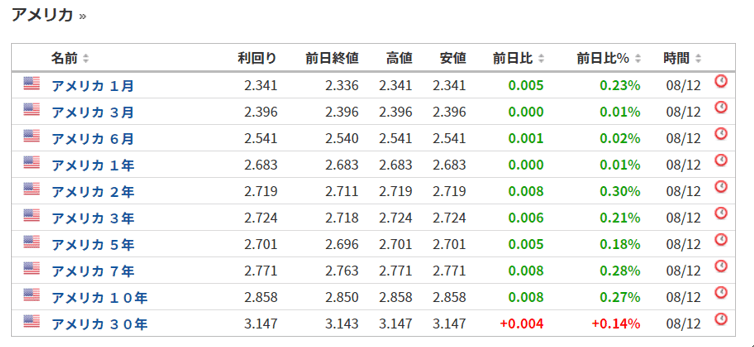 下の「アメリカ ○○」の「○○」はその満期・残存期間を指しています。