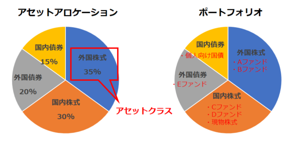 - ポートフォリオ:アセットクラスを構成する銘柄・商品の組み合わせを指す。