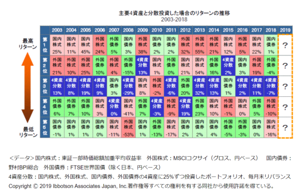 上記の表は、公的年金を運用するGPIFが「4つのアセットクラス(国内外の株式、債券)の各年リターン」と「4つのアセットクラスを組み合わせて分散投資した際の各年リターン」の推移を記載した表です。