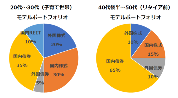 ライフステージにあわせて投資目標が変わっていけば、それにあわせて計画的にポートフォリオを変更していくことが必要になってきます。ここでは一般的な事例として、ライフステージ別のモデルポートフォリオを紹介しましょう。