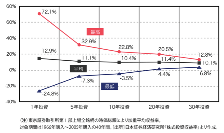 投資先が成長することを前提とすれば、投資期間が長期になるほど、短期的な値動きのブレが小さくなり、安定したプラスのリターンが得られることが、過去のデータからも示されています。