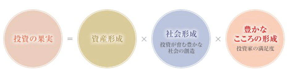 また株価や配当、基準価額といった数値上の結果だけでなく、投資する先の会社が行う事業、その事業やそこに関わる人によって創造される「社会形成」や、 価値を創造する会社と関わることによって得られる投資家の「こころの満足度」にも重点が置かれています。