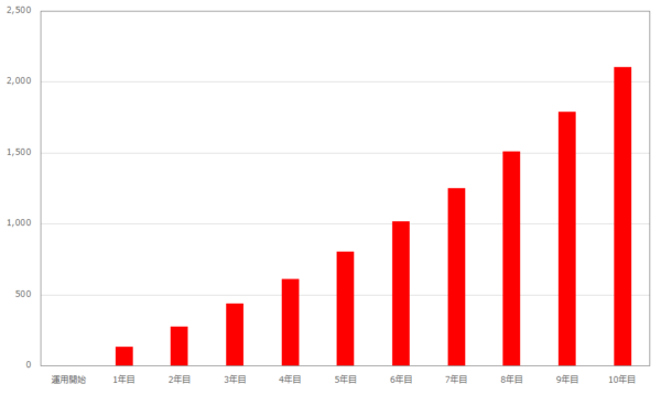 こちらは、毎月10䞇円の資金を利回り10%の投資信蚗に投入した堎合のシミュレヌションです。ハむペヌスでの運甚が必芁なため、貯金は行っおいたせん。