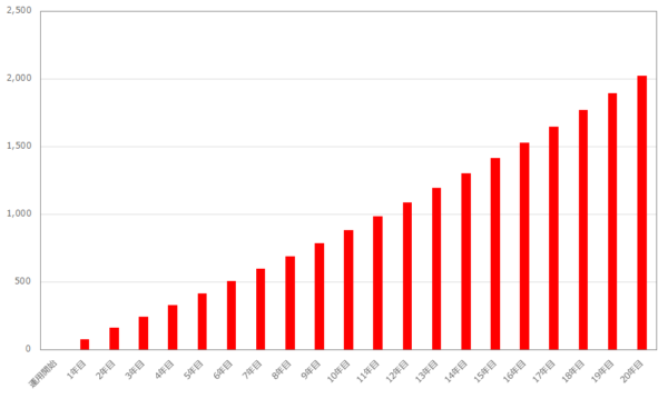 2,000䞇円を20幎間で貯めるわけですから、1幎間に必芁な貯金の額は2,000䞇円÷20幎100䞇円/幎です。しっかりず貯金を意識しなければ、達成が困難である金額でしょう。