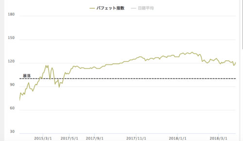 2018年3月15日時点でのバフェット指数は1.23と、指数上はかなり過熱感が高まっている状況であり、株価暴落には一応の警戒が必要な状況となっています。