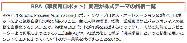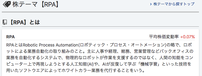 以下のサイトではRPA、働き方改革というテーマでスクリーニングして、関連銘柄を一覧で検索できます。