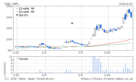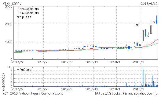 【2018年2月には500円台だったヴィンクス(3784)株価は2,000円を超えるま