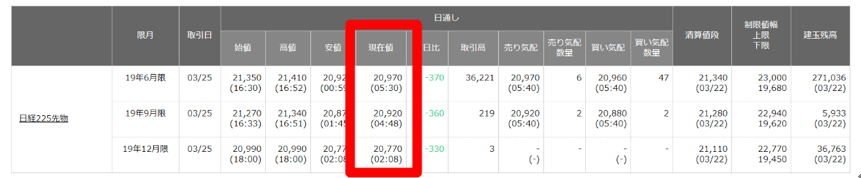 例えば、2019年3月末時点での各限月の日経平均先物の現在値を見てみましょう。