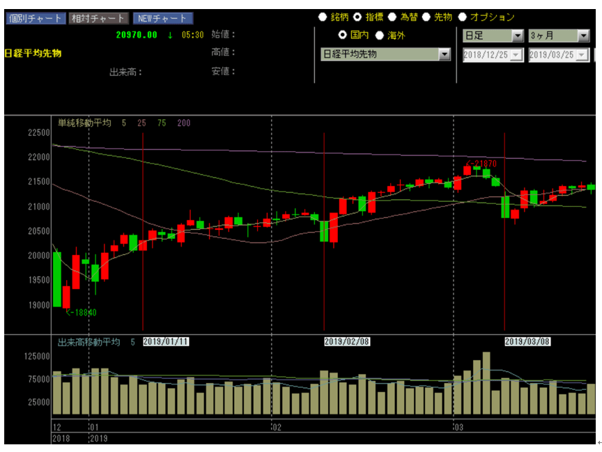 2019年の1~3月の日経平均先物の日足チャートを対象に、アノマリーを利用した投資戦略を考えてみましょう。