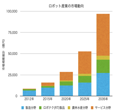 åè¿°ã®NEDO(åœç«ç ç©¶éçºæ³äººæ°ãšãã«ã®ãŒã»ç£æ¥æè¡ç·åéçºæ©æ§)ã«ããæšèšã§ããããããç£æ¥ã®åžå ŽèŠæš¡ã¯2020幎ã«çŽ2.9å åã2035幎ã«ã¯çŽ9.7å åãŸã§æ¡å€§ãããšäºæ³ãããŠããŸãã