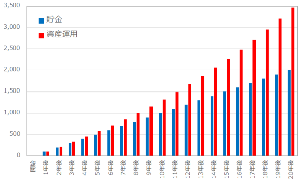 æ¯å¹Ž100äžåã20幎éã貯éããå Žåãšæè³ããå Žåã®ã·ãã¥ã¬ãŒã·ã§ã³ãæ¯èŒããŠã¿ãŸããããã·ãã¥ã¬ãŒã·ã§ã³ã§ã¯ã貯éã®å©åãã0ããŒã»ã³ããæè³ã®å©åãã5ããŒã»ã³ããšããŸããã