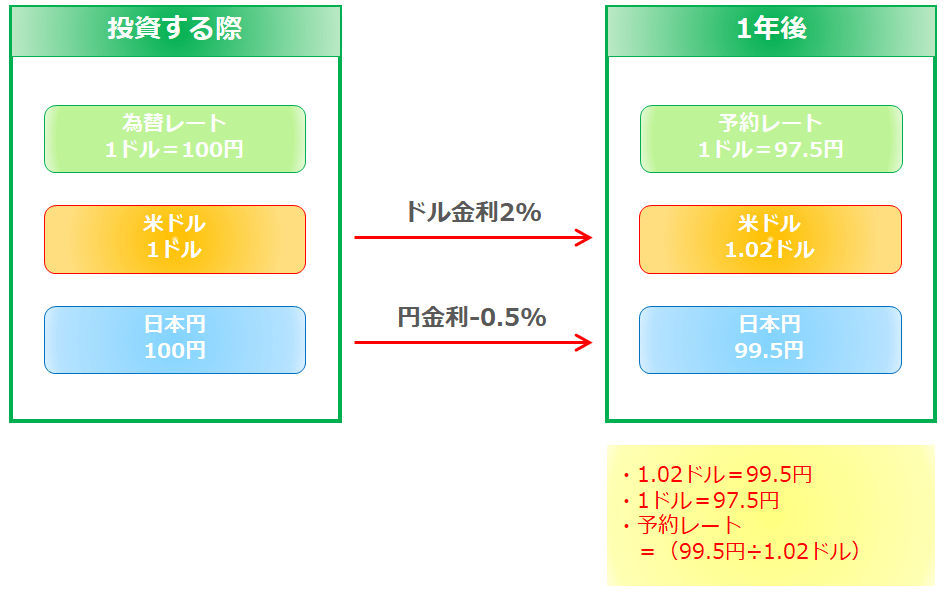 投資する際のレートでは1ドル=100円なので、1ドルを米ドルの金利で、100円を日本円の金利で運用したとします。1年後には、1ドルは1.02ドル、100円は99.5円になっています。すなわち1.02ドル=99.5円、整理すると1ドル=約97.5円となり、これが予約レートとなります。投資する際のレートが1ドル=100円、予約レートが1ドル=約97.5円なので、その差は約2.5円です。