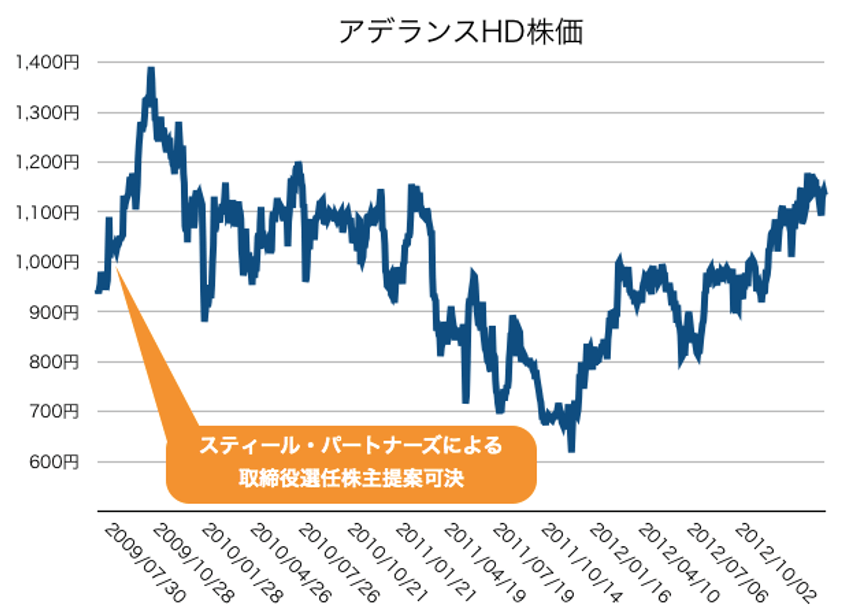2009年5月、アメリカの投資会社スティール・パートナーズは、アデランス(現在は非上場)に対して、自社の推す取締役8人の選任を求める株主提案を行いました。