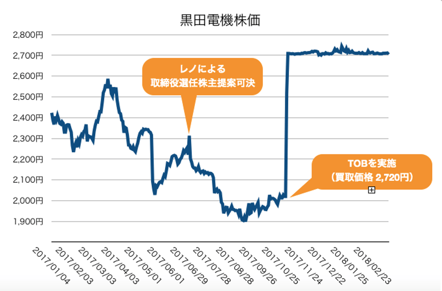 この結果を受け、黒田電気は2017年10月、アジア系投資ファンド・MBKパートナーズ傘下のKMホールディングスによるTOBを受け入れ、傘下に入る選択を行い、黒田電気の株価は1週間で33.6%急騰しました。