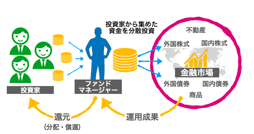 投資信託は一般の投資家から資金を募り、運用のプロであるファンドマネージャーがその資金で株式や債権、デリバティブ、不動産などさまざまな金融商品に分散投資を行うもので、得られた利益は投資家へ還元される仕組みとなっています。