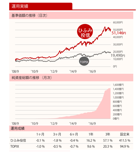 2012年のファンド設定来実績は2018年8月31日時点で+411.5%と、同期間のTOPIXのパフォーマンスの+94.9%を大きく上回っています。