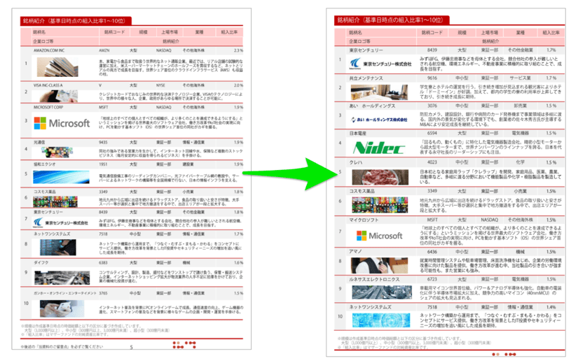 その言葉通り、直近の銘柄の組み入れ比率を見てもポートフォリオの内容に変化が生じてきていることが分かります。