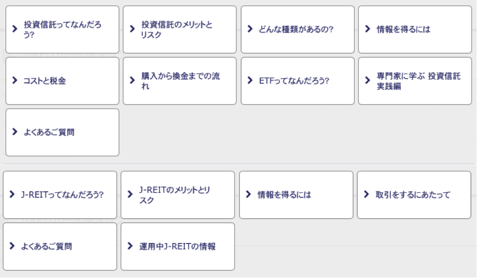 投資信託協会のサイトでは投資信託やREIT(不動産投資信託)について、仕組みやメリット・デメリット、選び方、購入方法からコストや税金まで、投資信託へ投資をする上で知っておくべき基本的な内容は、ひと通り知ることができます。