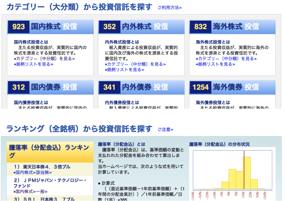 投資信託協会のサイトでは投資信託を検索できるようになっており、投資対象(国内株式、海外債券、不動産など)別に騰落率(運用成績)、純資産額(投資信託の規模)のランキングを知ることもできます。