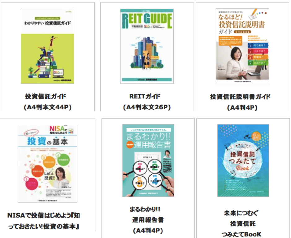 投資信託協会のサイトから申し込むと、投資信託協会発行の投資信託やREITに関するガイドブックを無料でもらうことができます(1人1セットまで)。
