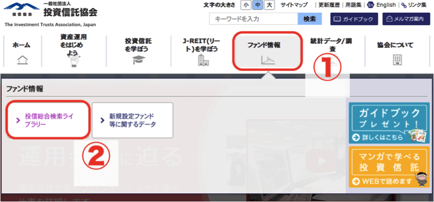 ①投資信託協会サイトのトップページ【ファンド情報】の中から【投信総合検索ライブラリー】を選択