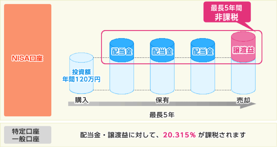 通常であれば株式投資で得た利益には約20%という高い所得税がかかるのですが、NISA口座であれば年120万円の投資枠を使って出た利益は無課税になります。