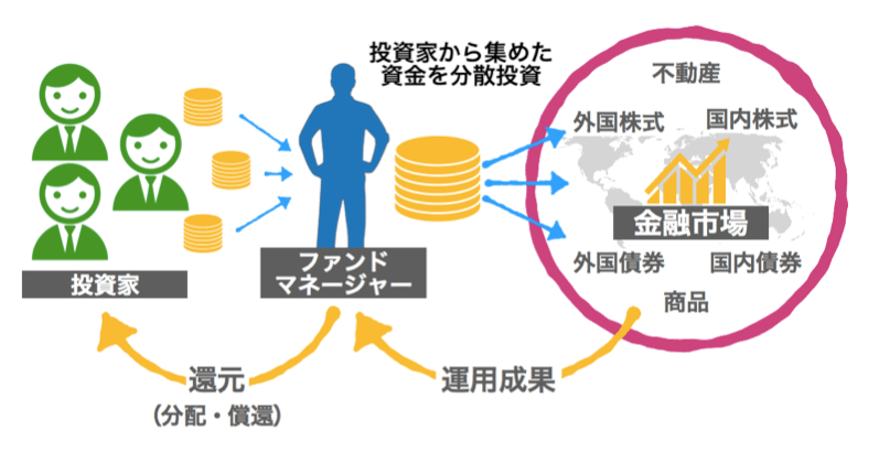 | 公募 | 不特定多数(50人以上)の投資家から資金を募り、運用を行う。投信法により設定され、組み入れる商品や配当などに関して規制を受ける。 |