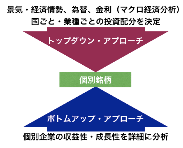 | トップダウン アプローチ | 国、あるいは世界全体の景気・経済情勢、為替、金利といったマクロ経済を分析し、今後見通しから国ごと・業種ごとの投資配分を決定。その業種の中から、個別銘柄を選定する。 |