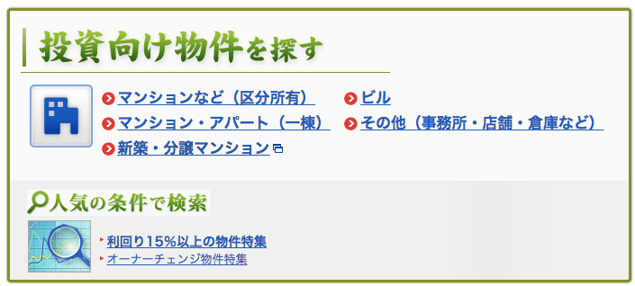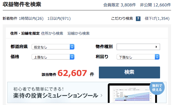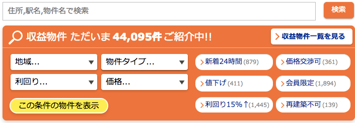 ホームズや楽待と比べるとややマイナーですが、それだけ穴場物件が掲載されている可能性もあるので本気の投資家は要チェックです。