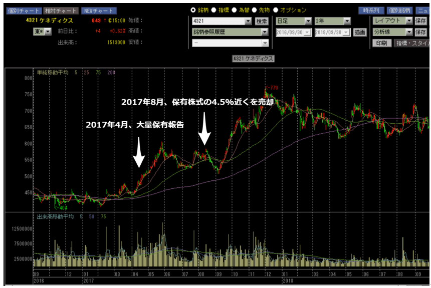 大量保有がわかれば買いが入り、保有銘柄の売却がわかれば売り圧力が強くなる、というのが少なくとも数か月の需給動向やその銘柄の売買センチメントに影響を与えていることは間違いありません。