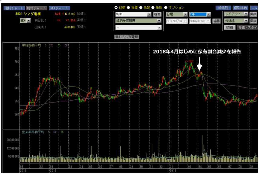 最後に見ていくのが日本のアクティビストであるエフィッシモ・キャピタル・マネージメントが電気量販店大手のヤマダ電機 <9831> の保有比率を下げた後の株価推移です。