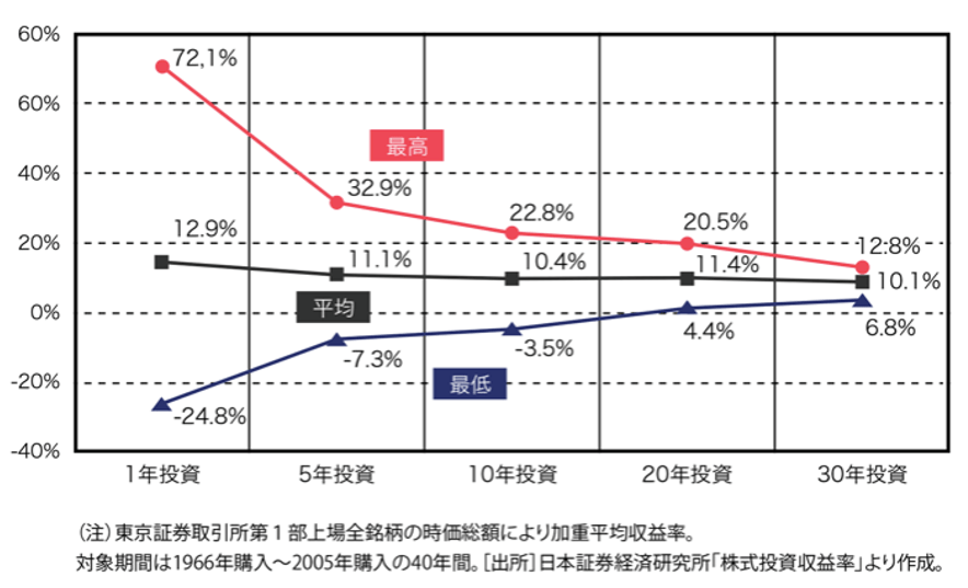投資商品は、価格が短期的に大きく変動することもありますが、値動きのブレは、一般的に投資期間が長くなるほど小さくなります。