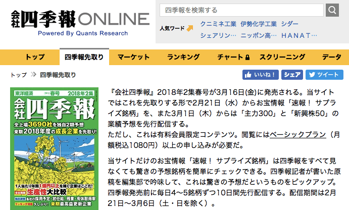 また有料会員限定で「四季報先取り」として、四季報発売前月下旬から配信されるため、いち早く情報を得ることができるというメリットがあります。