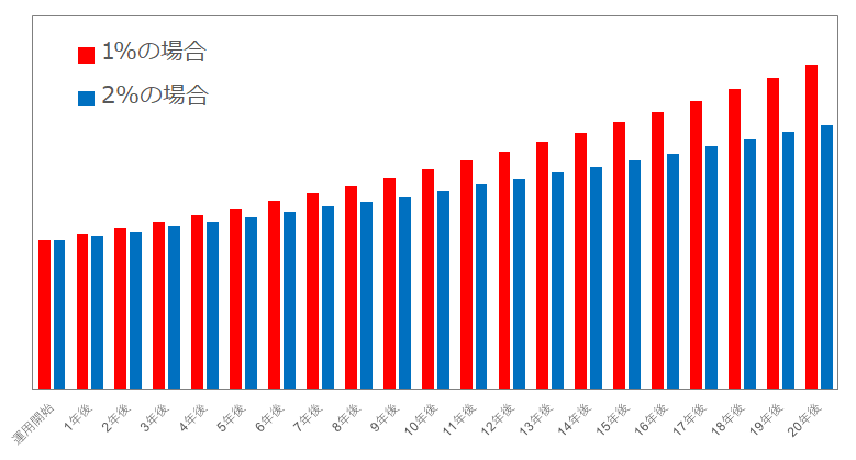 1パーセントと2パーセントはどちらも微々たる手数料に感じられますし、その差異はたったの1パーセントでしかありません。「○%」と表示されるので小さく些末な問題に感じられますが、この小さな差は運用成果に大きな影響を与えるのです。