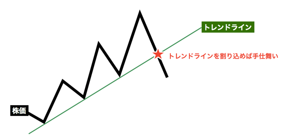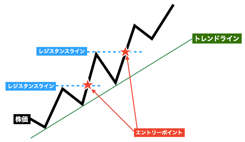 エントリーするタイミンングとしては、トレンドラインまで下落した株価が反発し、直近高値(レジスタンス)を上回ってトレンド継続が確認できたポイントが、最もオーソドックスなものです。