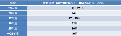 一方で、平成24年度以降に新設の太陽光発電施設については、買取価格の段階的な引き下げが行われ、平成29年度以降については入札制度(出力2,000kW以上が対象)が導入されています。