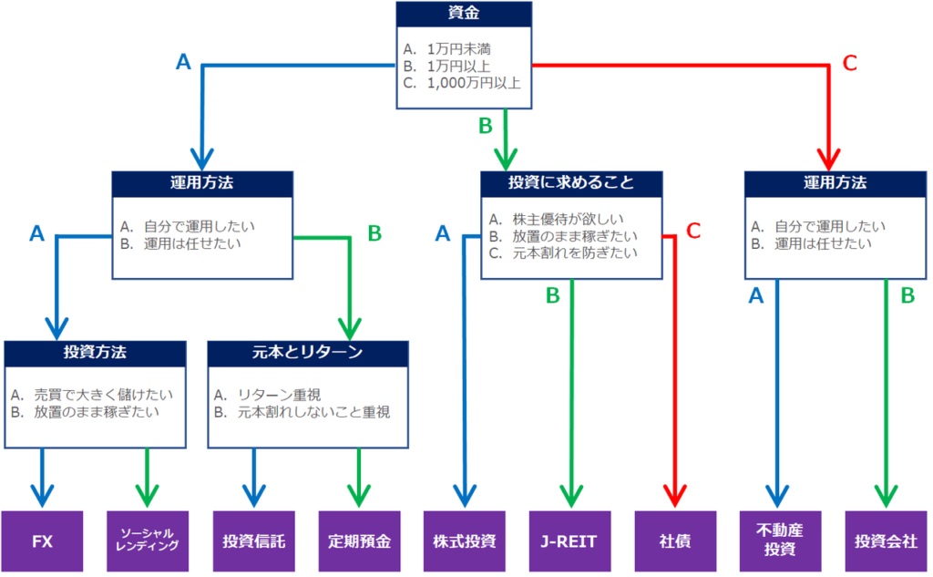 そこで、2つから3つの簡単な質問に答えるだけで、自分にぴったりな投資手法を見つけられるフロー図を作成しました。ぜひこの図を使って、自分に合った投資手法を選んでみてくださいね。