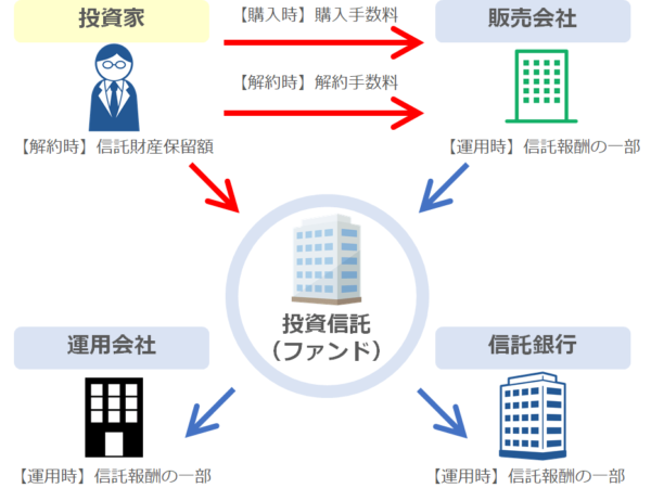 投資信託は人に投資を任せる投資手法のため、ファンドの購入・運用・売却の都度手数料がかかります。