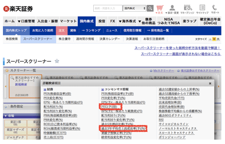 楽天証券のスクリーニング機能には、直接PEGレシオの値で銘柄をスクリーニングできる機能があります。