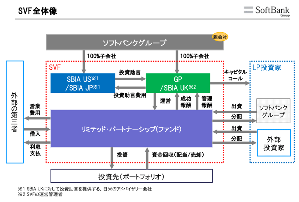 ãœãããã³ã¯ã»ããžã§ã³ã»ãã¡ã³ãïŒä»¥äžãSVFïŒã¯ãã€ã®ãªã¹ã«æ ç¹ã眮ããœãããã³ã¯ã°ã«ãŒãã®100ïŒ åäŒç€ŸãSoftBank Investment AdvisersïŒSBIAïŒ UKããGPïŒGeneral PartnerïŒéå¶ç®¡çè ïŒãšãªããåãã100ïŒ åäŒç€Ÿã§ãããSBIA USïŒç±³åœïŒã ããã³ãSBIA JPïŒæ¥æ¬ïŒããSBIA UKã«å¯ŸããŠæè³å©èšãè¡ããšããä»çµã¿ãšãªã£ãŠããŸãã